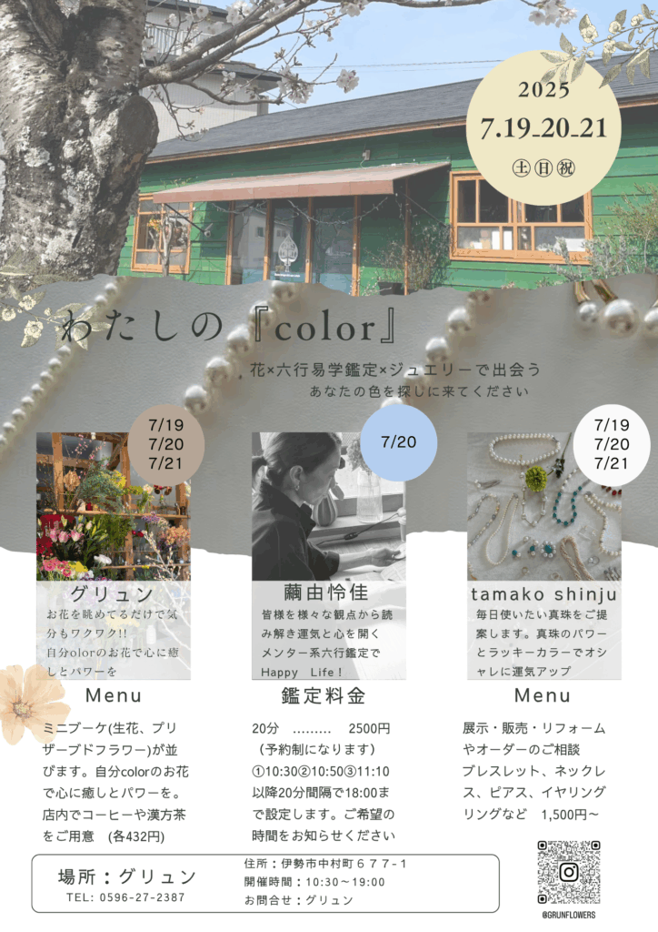 伊勢市のおしゃれなお花屋さん 「grün(グリュン)」 にて、お花xパールジュエリーx六行鑑定のコラボイベントを開催しました。テーマはわたしの「Color(カラー)」。